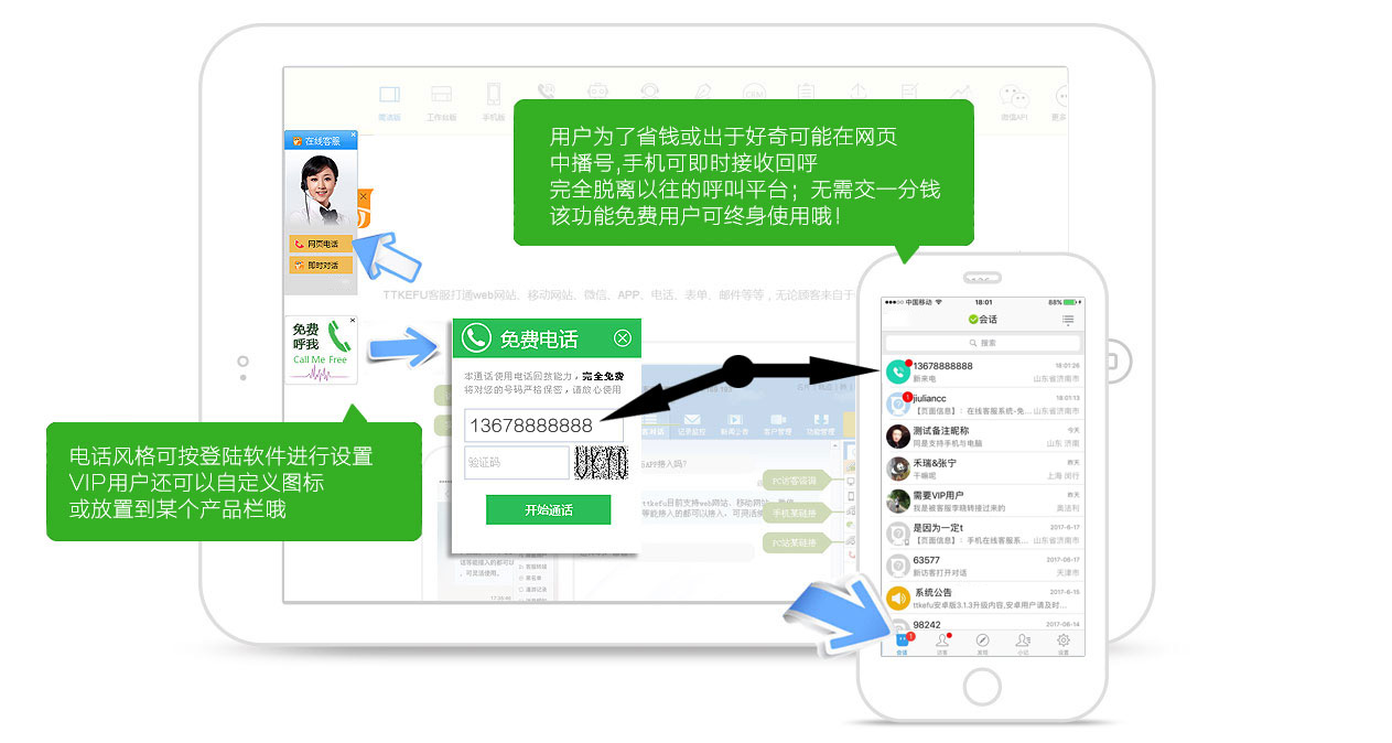 客服人員可以在手機(jī)端自動(dòng)接收顧客來電并提醒回播,完全花費(fèi)自己的本地話費(fèi);